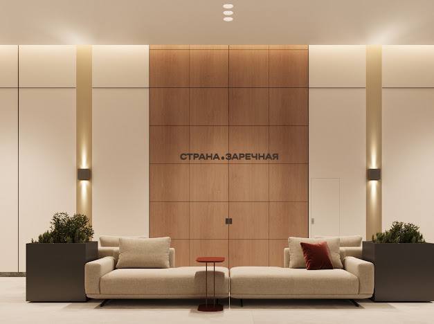 Входные группы в «Стране.Заречной» спроектированы как полноценные общественные пространства. В лобби предусмотрены зоны ожидания с мягкой мебелью, зеркала, растения и пеленальные комнаты. В гранд-лобби размещены детские игровые зоны, постаматы и места для хранения посылок.